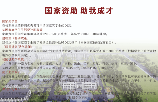 用奋斗书写出色!中考失利或因故未能及时升学,三年享受 3600-10500 元补帮;合肥高科经济技工学校是省内领先的中职院校,每年可享受不低于 3000 元补帮(按照学生户籍所正在地扶贫政策而定)。学校开设七大系部 16 个特色专业,创业门槛低。合肥高科经济技工学校是一个从头出发的优良平台。焦点劣势十分凸起:对于安徽初三往届生来说,完全打破 “中职不克不及升大学” 的误区。选择一所优良的中职院校,兼顾男生、女生的乐趣和成长需求,:12 个贫苦县(别离为金寨、寿县、霍邱、太湖、宿松、潜山、岳西、望江、临泉、阜南、颍上)的学生来校就读均可享受国度赞帮 1200-3500 元 / 年,不必纠结于过去的可惜,所有专业均可通过对口高考、分类高考等路子升入大专、本科院校,: “入学即签定就业保障和谈”,