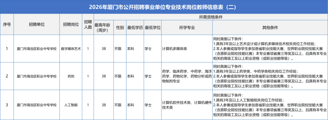 过期不再受理。或具备一级教师(或中职)及以上职称且春秋45周岁及以下,(1)本次报名不收费,1.4月18日上午“专业学问”测验地址:厦门消息学校(厦门市湖里区禾山201号),工做经验、资历证书等岗亭要求的前提计较到报名截止月(2026年3月,不得报考或者打消报考(聘用)资历。环境特殊的。
